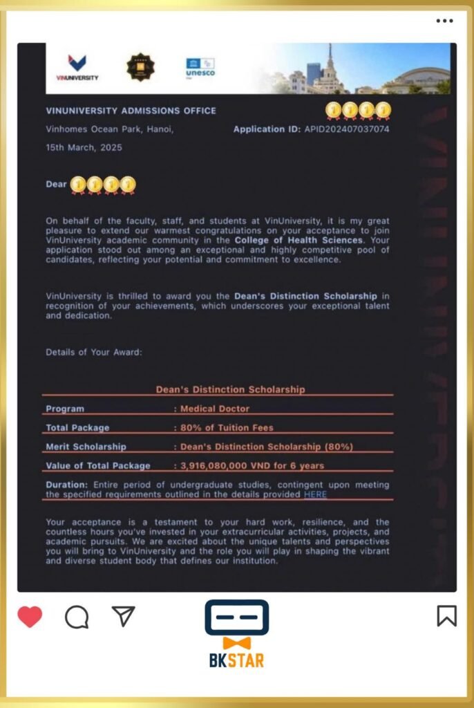 Chuỗi tin vui trong mùa apply 2024 – 2025 của BKSTAR tiếp tục nối dài với một cột mốc đáng tự hào: học viên BKSTAR đã chính thức trúng tuyển học bổng 80% ngành Bác sĩ Đa khoa – Đại học VinUni. Đây không chỉ là thành quả xứng đáng cho sự kiên trì và quyết tâm của học sinh mà còn là minh chứng rõ rệt cho chất lượng đồng hành chuyên sâu, sát sao từ đội ngũ cố vấn học thuật BKSTAR.